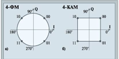 Відзначимо подібність модуляції 4-ФМ із КАМ. При 4-КАМ вершини сумарного вектора (IQ) лежать у вершинах квадрата (див. рис. 1.3 б), який вписується в коло 4-ФМ (див. рис. 1.3 а), тобто простори сигналів 4-ФМ та 4-КАМ збігаються. Таким чином, якщо вибрати однакові маніпуляційні коди, то сигнали 4-ФМ та 4-КАМ можна буде формувати і демодулювати одними і тими ж пристроями, що корисно використовувати при створенні уніфікованого модему OFDM для декількох видів модуляції.