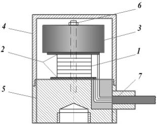 Рис. 2. Конструкция ПГ АГС: 1 – пьезоэлемент; 2 – изоляторы; 3 – инерционная масса; 4 – основание; 5 – крышка; 6 – винт; 7 - кабель