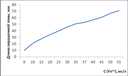 окрашенной зоны предложенного индикатора от концентрации железа (II) в растворе