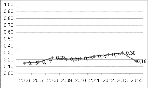 0.221 in 2009 to 0.381 in 2013, during the 2014 this indicator dropped to the