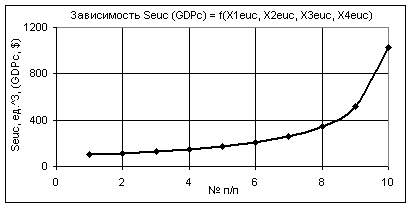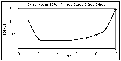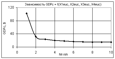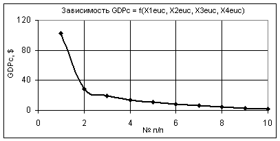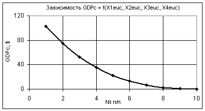 как изменяются GDPc при следующих значениях: Х1еuc = Х2еuc =1…0,1, Х3еuc = 1, Х4еuc = 0,99…0,1. В этом случае значения GDPc уменьшаются в 1000 раз.