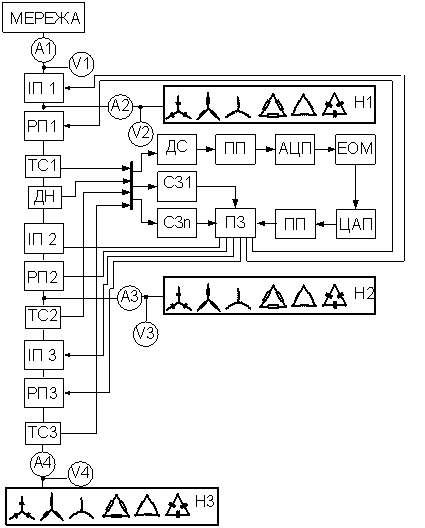 навантаження Н1-3; А1-3, аналогове вимірювальне обладнання V1-3.