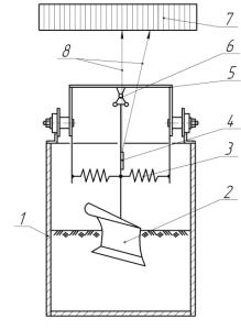 определения поперечной составляющей силы сопротивления: 1 – почвенный лоток; 2 – модель корпуса плуга; 3 – пружины; 4 – ОКГ; 5 – рама тележки; 6 – шарнир; 7 – шкала; 8 – отклонение светового луча ОКГ.