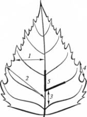 листа; 3 – відстань між основами першої і другої жилок; 4 – відстань між