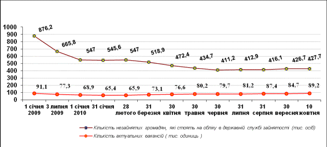 Рис.1.Чисельність незайнятих громадян та кількість вакансій з 2009-2010 рр. (За даними Держкомстату