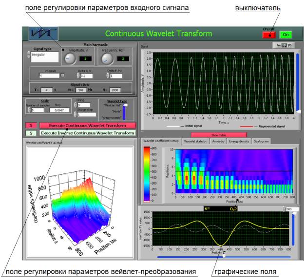 симулятора «Непрерывное вейвлет-преобразование» состоит из трех основных полей: