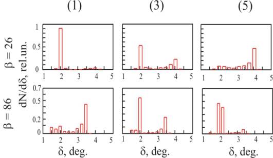 вылета рассеянных частиц dN/dδ, которая отражает их трансформацию при