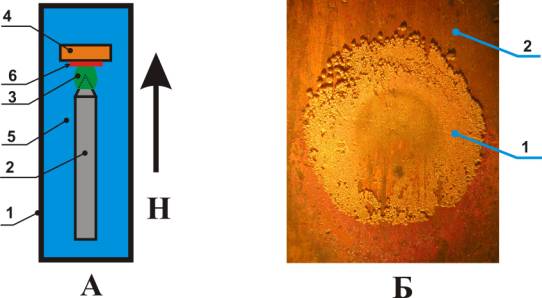 Проведение опытов. Схема установки для проведения экспериментов приведена на рисунке 1А. Стальной цилиндр (2) диаметром D, заточенный на конус под углом a, устанавливался на держателе в кювете (1), которая размещалась в зазоре магнитной системы. Магнитное поле было направлено вдоль оси цилиндра. На расстоянии L от кончика цилиндра (в непосредственной близости от области повышенной концентрации ионов Fe2+, обозначенной на рисунке 1А цифрой 3) устанавливалась медная подложка (4). Перед установкой поверхность медной подложки полировалась и обезжиривалась. Плоскость подложки была расположена перпендикулярно оси цилиндра. В кювету заливался 5% раствор медного купороса (5).
