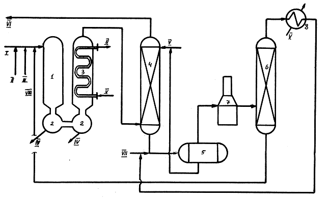 он направляется в скруббер 4, для отмывки водой (поток V) от сажи. Отмытый газ (поток VI) очищается от SO2, CO2,