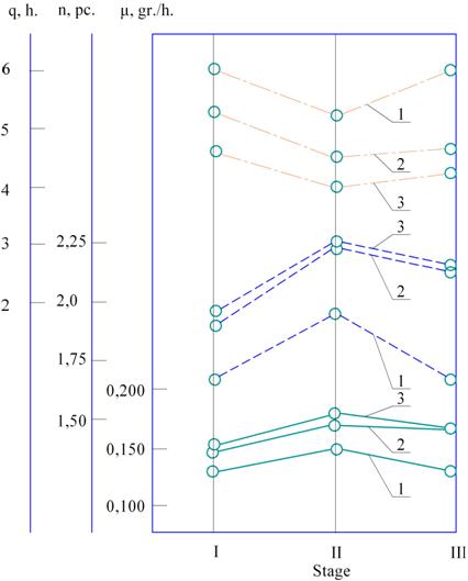 gr. (25 % dry matter); m1- amount of yeast at the end of the stage, gr.; t1 – t2 – duration of the stage, h.