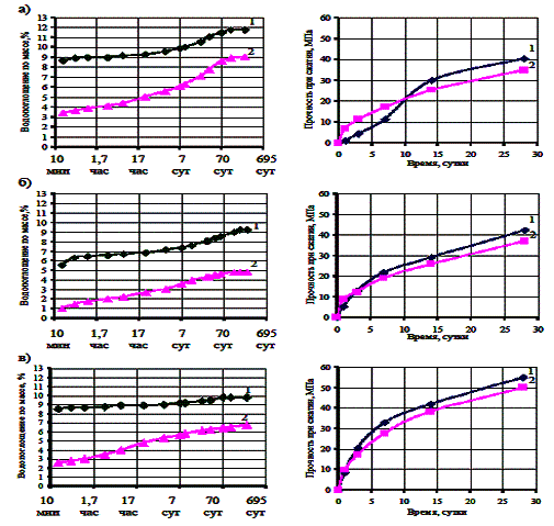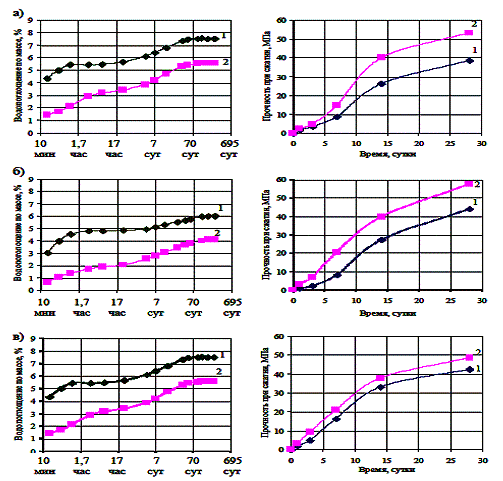 1 Кинетика водопоглощения (слева) и роста прочности при осевом сжатии (справа)