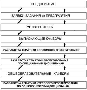 Организация непрерывного курсового проектирования начинается с запросов-задач предприятия университету. На выпускающих кафедрах разрабатывается тематика дипломного проектирования в соответствии с запросом предприятия. Затем выпускающие кафедры разрабатывают под тематику выпускных квалификационных работ тематику курсового проектирования по специальным дисциплинам. И наконец, на общеобразовательных кафедрах разрабатывается тематика курсового проектирования по общетехническим дисциплинам в соответствии с тематикой проектирования по специальным дисциплинам выпускающих кафедр (на рисунке показано наклонными стрелками).