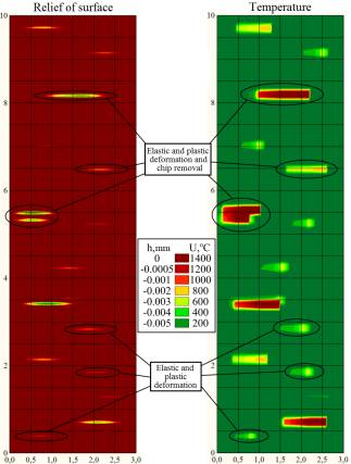 rough surface, contacts coordinates, depth of cut and friction in each of them, removed metal volume, nature of interaction (cutting or deformation), microcontact time.