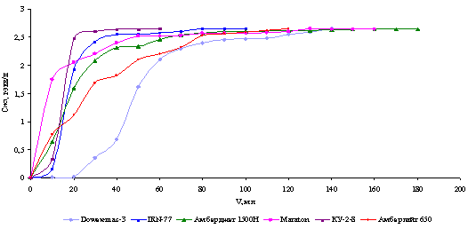 наилучшие результаты по качеству и скорости сорбции показали КУ-2-8 и Амберлайт