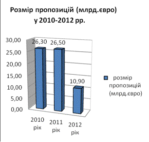 у 2012 році обсяги як укладених угод, так і пропозицій знизився майже у двічі і основною причиною такого падіння була нестійка