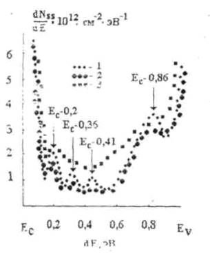 данными, указывающими на существенное усложнение расыределения плотности поверхностных состояний на границе Si-SiO2 [3].