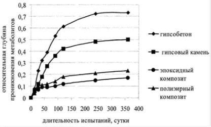 Гипсовый камень менее проницаем для метаболитов. Относительная глубина проникновения, после 360 суток