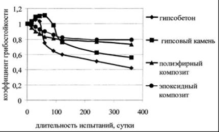 В результате исследований установлено, что воздействие метаболитов плесневых грибов в течение 360 суток способствует снижению коэффициента грибостойкости всех исследуемых материалов. Однако в начальный период времени первые 60 суток у гипсобетона и гипсового камня наблюдается повышения коэффициента грибостойкости, вероятно в результате уплотнения структуры данных материалов. Затем (60-120 сутки) наблюдается резкое снижение коэффициента грибостойкости. После этого процесс замедляется и коэффициент грибостойкости достигает минимального значения: у гипсобетона - 0,42, а у гипсового камня -0,56. У полимеркомпозитов уплотнения не наблюдалось, а происходило лишь снижение коэффициента грибостойкости, особенно активно, в первые 120 суток экспозиции. После 360 суток экспозиции коэффициент грибостойкости у полиэфирного композита составил 0,74, а у эпоксидного - 0,79.