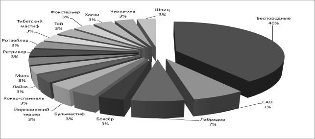 ротвейлер) – 30%. Остальные 30% распределились среди мелких пород: йоркширский