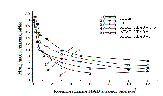 по величине, что свидетельствует о взаимном притяжении разнотипных ПАВ. Максимальное