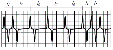 интервалы обозначены, как t1 – длительность «1» и t0 – длительность «0». Период «0» в два раза больше периода «1».