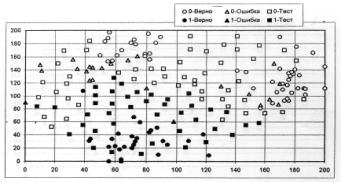 подаются значения размерности порождаемой конфигурации, количества точек 1–го и 2–го классов, вид и параметры конфигурации,
