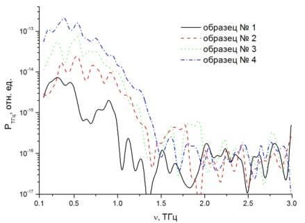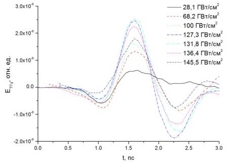 амплитуды терагерцовых импульсов для образца № 3 наблюдался при пиковой