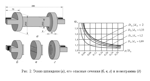 Универсальный шпиндель имеет несколько опасных сечений, дана оценка циклической прочности по наиболее опасному из них (рис.2, г).