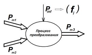 материальных потоков Pm1 и Pm2 появляется третий преобразованный поток Pm3, при этом процесс преобразования подчиняется законам,