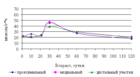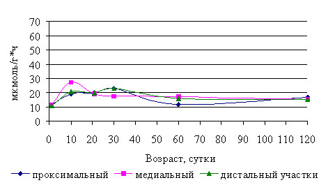 двухмесячных на 27,6%, р<0,05, в дистальном – до 19,87±1,36 мкмоль/г*ч, ниже, чем у двухмесячных