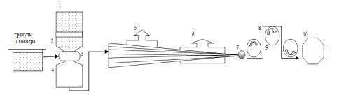 расплава; 3–насос; 4- фильтр и фильера; 5–воздушный