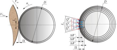 Поскольку в процессе обработки с поверхности заготовки снимается припуск равный двойной глубине резания на каждом обороте заготовки, то в каждый момент времени действительный размер круга равен R + ∆R’, где ∆R’ – глубина резания.