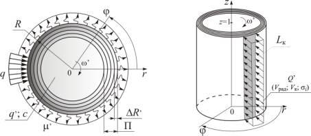 На круг действует тепловой источник мощностью Q’, Дж/мм2·с·К при прохождении точки на поверхности круга зоны резания (дуги контакта) с угловой скоростью ω’, рад/с. За пределами действия теплового источника с обрабатываемой поверхности происходит теплоотдача с коэффициентом μ’, Дж/м2·с·К, внутри круга – с коэффициентом ν’, Дж/мм3·с·К.