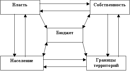 В соответствии со структурой государственного управления население избирает власть, которая, в свою очередь, учреждает отношения собственности, замкнутые в географические границы, в пределах которых это население проживает. Располагая собственностью власть, формирует бюджет, структурирующий основу взаимодействия населения с собственностью. Это взаимодействие осуществляется в форме спецификации прав собственности различными группами населения, владеющими различными долями в собственности территориального образования и соразмерно этому способными оказывать какое-либо воздействие на власть.