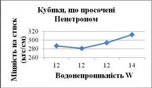 2 – Відношення водопроникності до міцності бетону (кубики, що просочені Пенетроном)