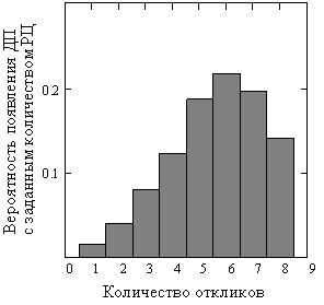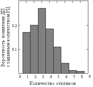 В таблице 1 представлены ряды распределения, а на рис. 6 гистограммы распределения числа откликов в ДП самолета А-319 при ограничении нормированного ДП снизу на уровне h=0,1. Анализ показывает, что максимальное несоответствие dp частот появления ДП с одинаковым количеством откликов составило dp=0,045, причем максимальная частота соответствует ситуации формирования ДП с 6-ю откликами, которых получено около 20 % от общего числа.