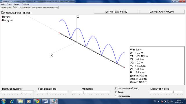 разомкнутой линии. График распределения тока очень похож на предыдущий. Разница