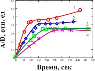 Рисунок 1. Зависимости от времени параметра А/D. Кривая 1 – D=2 мм, Кривая 2 – D=3 мм, Кривая 3 – D=4 мм, Кривая 4 – D=6 мм