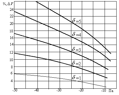 воздуха (% ∆V) от величины разрежения (Па) и размера щелей (