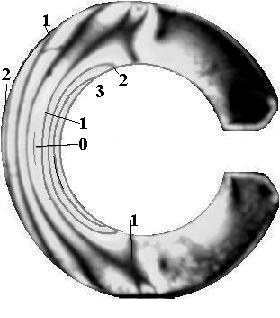 изохром при нагрузке в 1200 ньютон (0, 1, 2, 3 – номера полос). Цена полосы