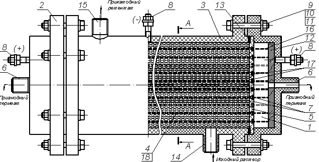 13 – прокладка; 14 – штуцер ввода исходного раствора; 15 – штуцер вывода