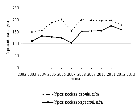 Рис.1. Динаміка урожайності картоплі та овочів Вінницької