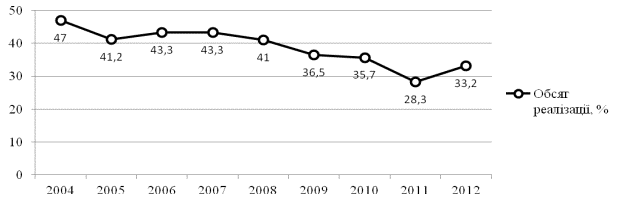 видно, що за період з 2004 по 2012 роки обсяги реалізації суттєво зменшились,