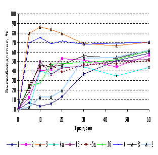 среде 0,1М НС1 также проходило с разной скоростью (рис 2б). Однако к 45 мин из