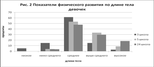Большинство обследованных детей имели средние показатели длины тела как в г. Красный Луч, так и в г. Луганске. Однако в г. Луганске наблюдается значительное увеличение длины тела – выше средней и высокая – как у мальчиков, так и у девочек в отличие от школьников г. Красный Луч, у которых наблюдается уменьшение длины тела – ниже средней – как у мальчиков, так и у девочек (рис. 1, 2).