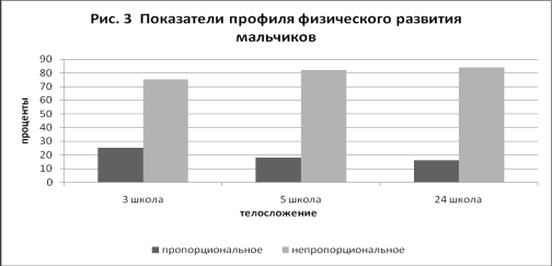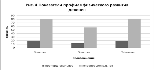 При оценке профиля физического развития наблюдается преобладание непропорционального телосложения у всех без исключения школьников гг. Красный Луч и Луганска (рис. 3, 4).