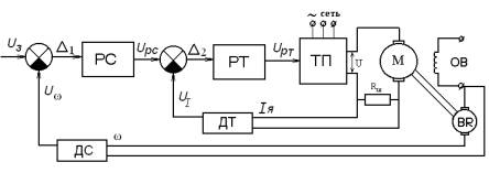 РС – регулятор скорости; РТ – регулятор тока; ТП – тиристорный преобразователь; М – двигатель; BR – тахогенератор; ОВ – обмотка возбуждения; RШ – шунтирующее сопротивление; ДТ – датчик тока; ДС – датчик скорости; UЗ – задающее напряжение; ∆1 – разница между задающей величиной напряжения и выходной; Uрс – выходное напряжение регулятора скорости; ∆2 – разница между задающей величиной тока и выходной; Uрт – выходное напряжение регулятора тока; UI – выходное напряжение датчика тока; IЯ – ток якоря двигателя; Uω – выходное напряжение датчика скорости; ω – выходная величина (скорость вращения двигателя).
