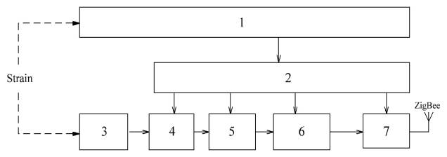 generator; 2 – battery; 3 – sensing elements; 4 – measuring circuit; 5 – analog-to-digital converter; 6 – microcontroller;