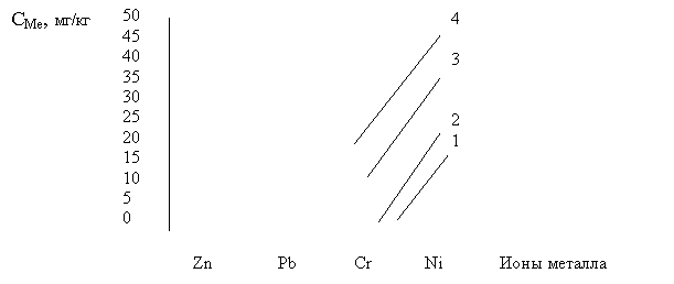2 – концентрация металла в почве на нижней границе отвала; 3 – то же на