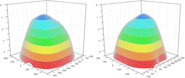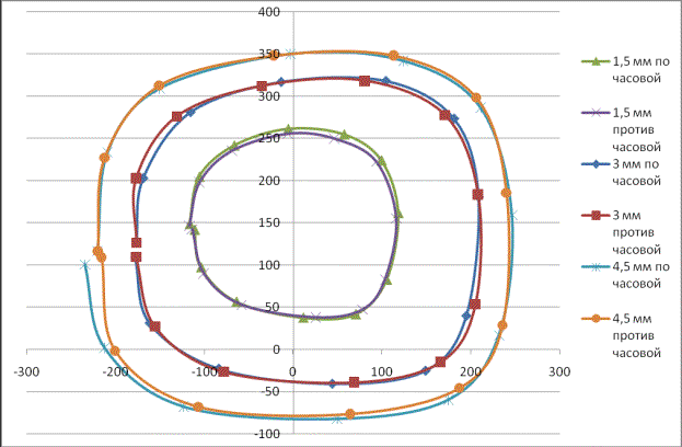 поверхностная диаграмма зависимости показаний X и Y от угла и величины отклонения